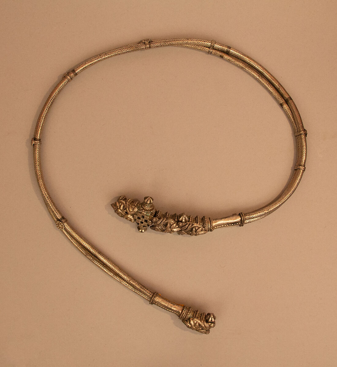 Jewels worn around the waist are known from sculptures of goddesses in India since antiquity. This heavy silver example is evidence that this type of ornament continued to be worn into the nineteenth century. Braided silver wire belts of this type are known to have been produced in Maharashatra and Andhra Pradesh.