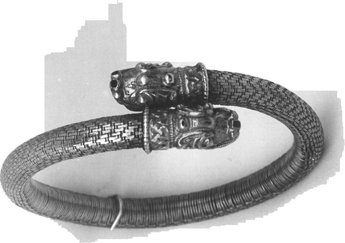 Bracelets decorated with confronting animal heads are known from various cultures since antiquity. In India the terminals of bracelets or anklets are commonly ornamented with makara heads. The makara is a mythic water monster which combines the features of a crocodile, elephant and fish and is believed to be a protective form.