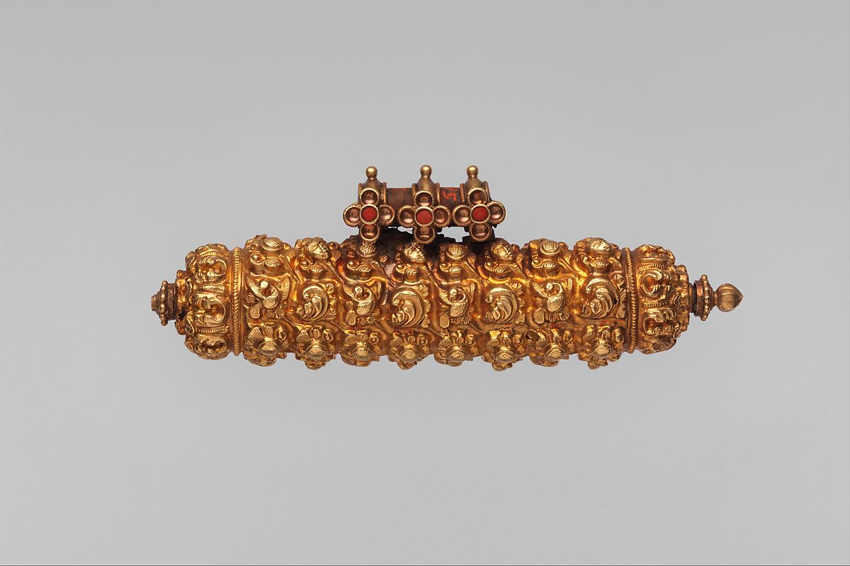 This gold and coral amulet case is decorated with a variety of vegetal and figural forms. The body is chiseled in relief in eight rows, comprised of alternating human faces, bird and floral motifs. The elongated shape of the amulet alludes to a form that would have held rolled up pieces of paper inscribed with holy words.