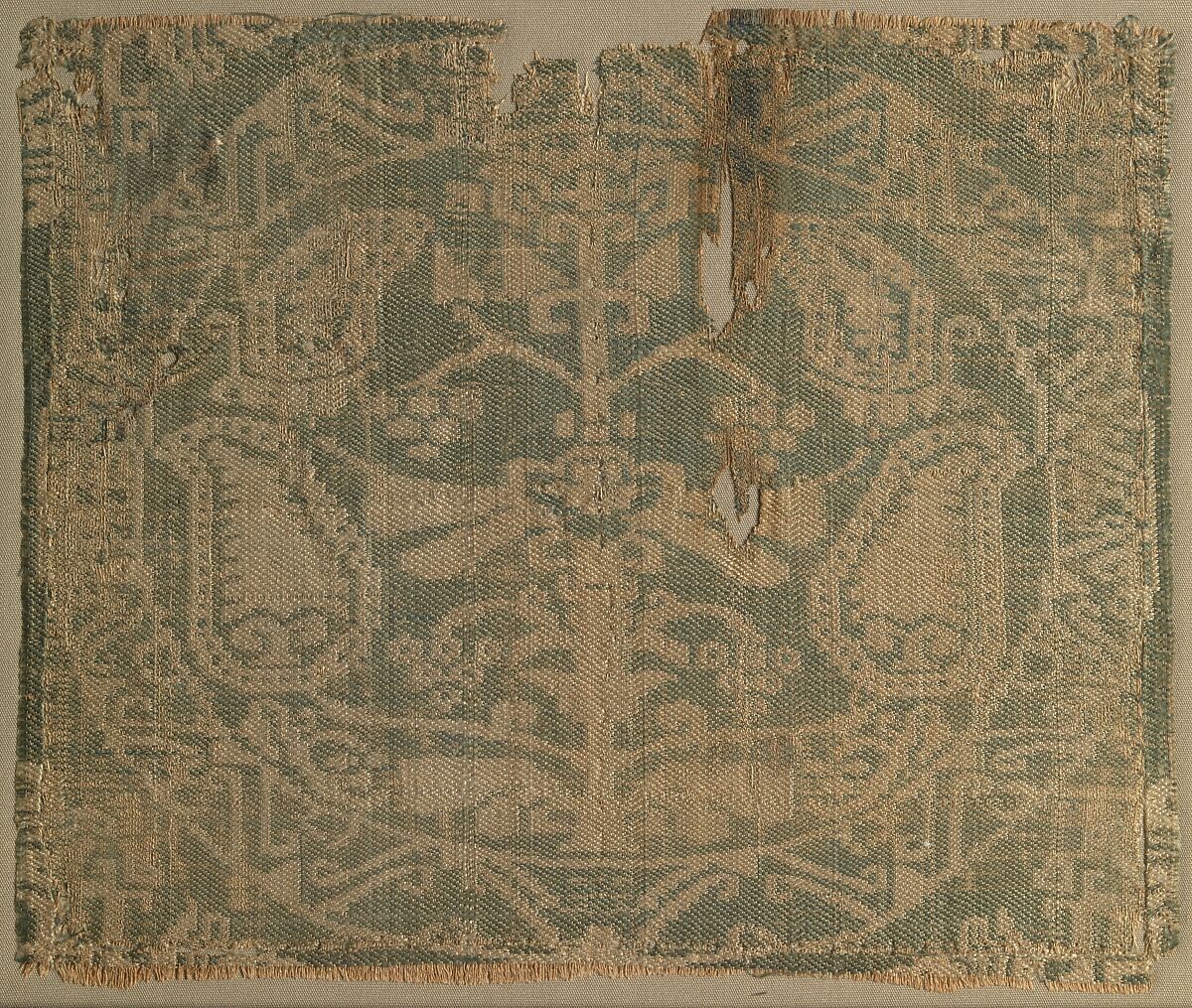 This beige and green silk textile fragment displays a roundel with a border of scrolling vines and leaves, at the center of which a stylized tree of life appears, bearing flowers, leaves, and fruit. The composite tree, as well as the fragmentary abstract floral designs around it, can be understood as an Islamic interpretation of the composite tree motifs popular in pre-Islamic Sasanian art. This fragment may have originally been part of a tunic or other garment, and is stylistically related to similar textiles found in Egypt.