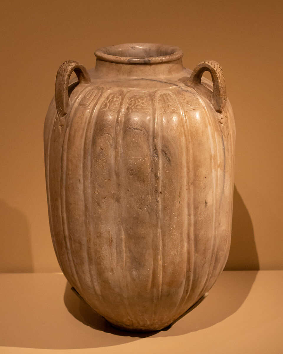 Large marble jars were used to store drinking water, either for use in a private residence or, as is probably the case with this example, a public building. The inscription on this jar indicates that it was an endowment by the amir Zain al‑Din Yahya al‑Ustadar, who served as majordomo during the reign of Sultan Jaqmaq (r. 1438–53) and subsequent rulers. The jar was perhaps intended for use at the mosque that he commissioned in 1444, which still stands in Cairo.