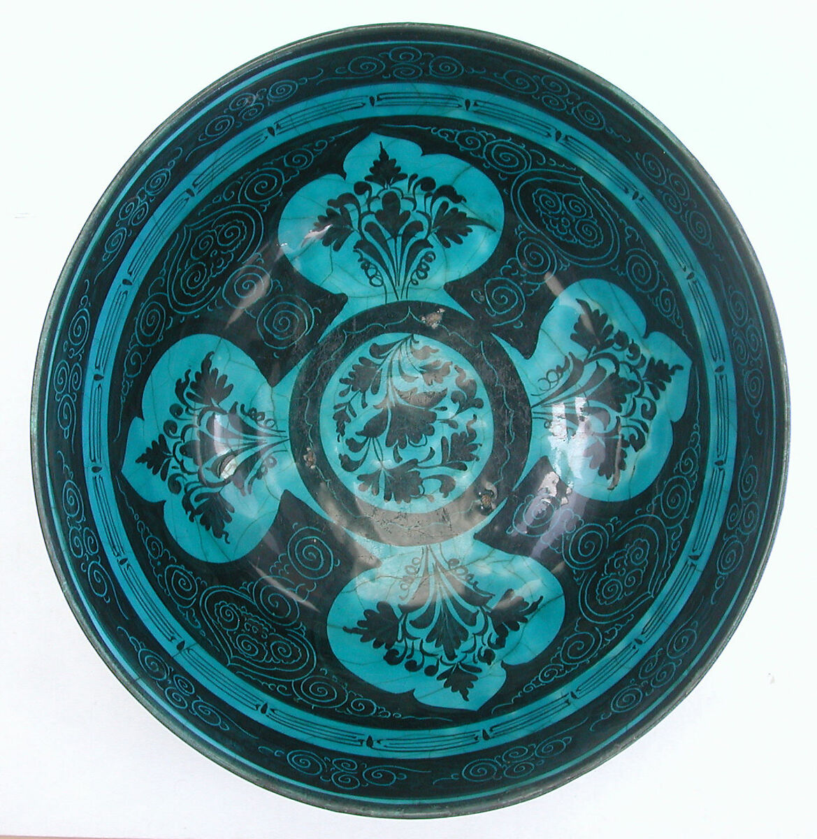 This striking turquoise‑and‑black bowl belongs to a group of ceramics known as Kubachi ware. Named for a village in the Caucasus where this pottery was discovered in quantity, such wares may have been produced elsewhere in northwestern Iran. This bowl— painted in black under a pale turquoise glaze, with an incised pattern of spirals and floral elements—is among the earliest examples.