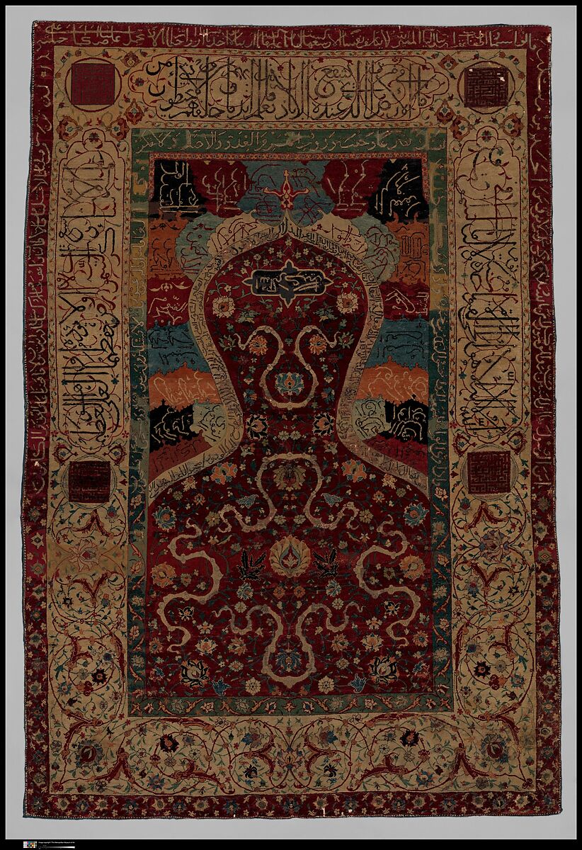 This prayer rug or sajjadah, identified by its central niche design, the Qur’anic inscriptions in its border, and the names of God in its spandrels, is consistent with a group of carpets thought to have been a diplomatic gift from the Safavid Shah ‘Abbas I to the Ottoman sultan Murad III (r. 1574–95). Because some of the verses promote a Shiite perspective by referring to the intercession of Shiite imams with God, the group was apparently never used by the Sunni Ottomans.