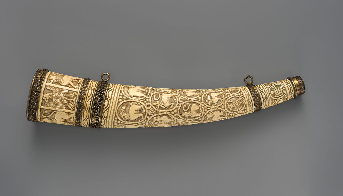 Fantastic and real creatures, juxtaposed within roundels, abound on the carved surface of this hunting horn. Ivory tusks of this type, used as reliquaries or symbols of land tenure, were apparently produced for both Muslim and Christian patrons in the medieval Islamic period. Similar motifs in contemporary textiles reveal the popularity of this repeating design.