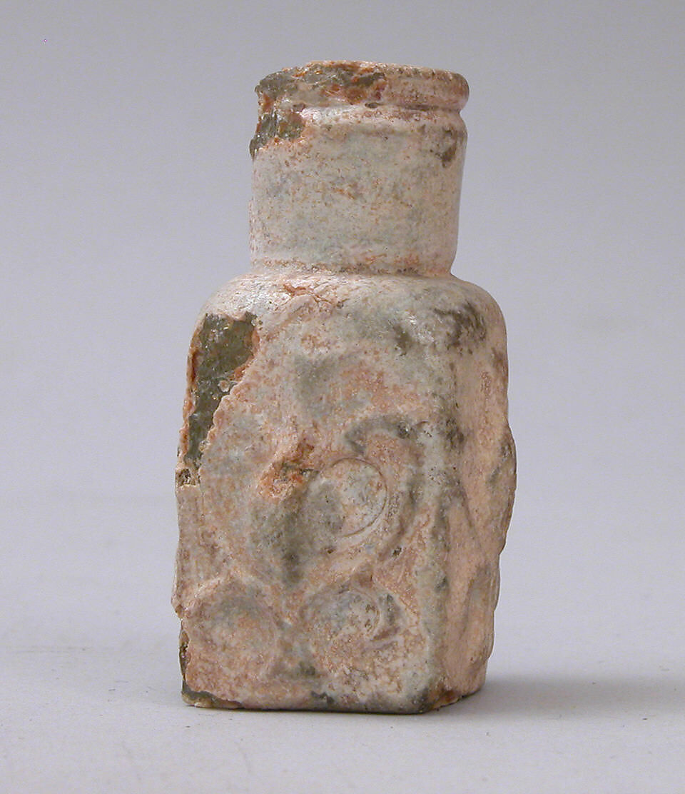 Considered to be a symbol of fertility, the pomegranate was frequently used as a decorative motif in the art of the Middle East. The palmette design with a pomegranate in the center that is seen on this flask also appears on several monuments in Greater Syria dating from the first half of the eighth century.