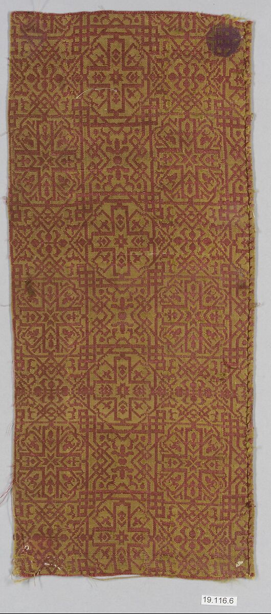 Geometric designs such as the ones in this fragment are found ornamenting a wide variety of media produced in Nasrid period (1232–1492) Spain, including tile work, woodwork, book binding, and painted stucco. The basic principle of the design is an eight-pointed star, and this pattern expands into a lattice of geometric possibilities. Such bold designs recall the famous wall patterns in the Alhambra palace in Granada.
