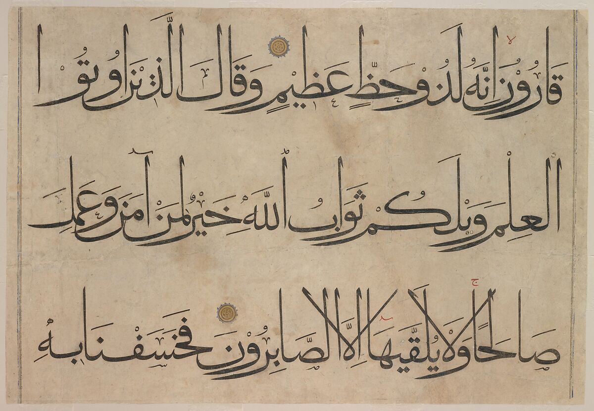 This fragment of a page comes from one of the largest copies of the Qur'an ever produced. Each line of script, written in the muhaqqaq style, is over three feet long, and each page was originally over seven feet tall. This page probably comes from a gigantic Qur'an that the calligrapher 'Umar Aqta' wrote for the ruler Timur (Tamerlane, d. 1405). Apparently Timur was unimpressed after 'Umar Aqta' wrote a Qur'an so small that it could fit under a signet ring, so the calligrapher wrote another Qur'an so large it had to be brought to Timur on a cart.