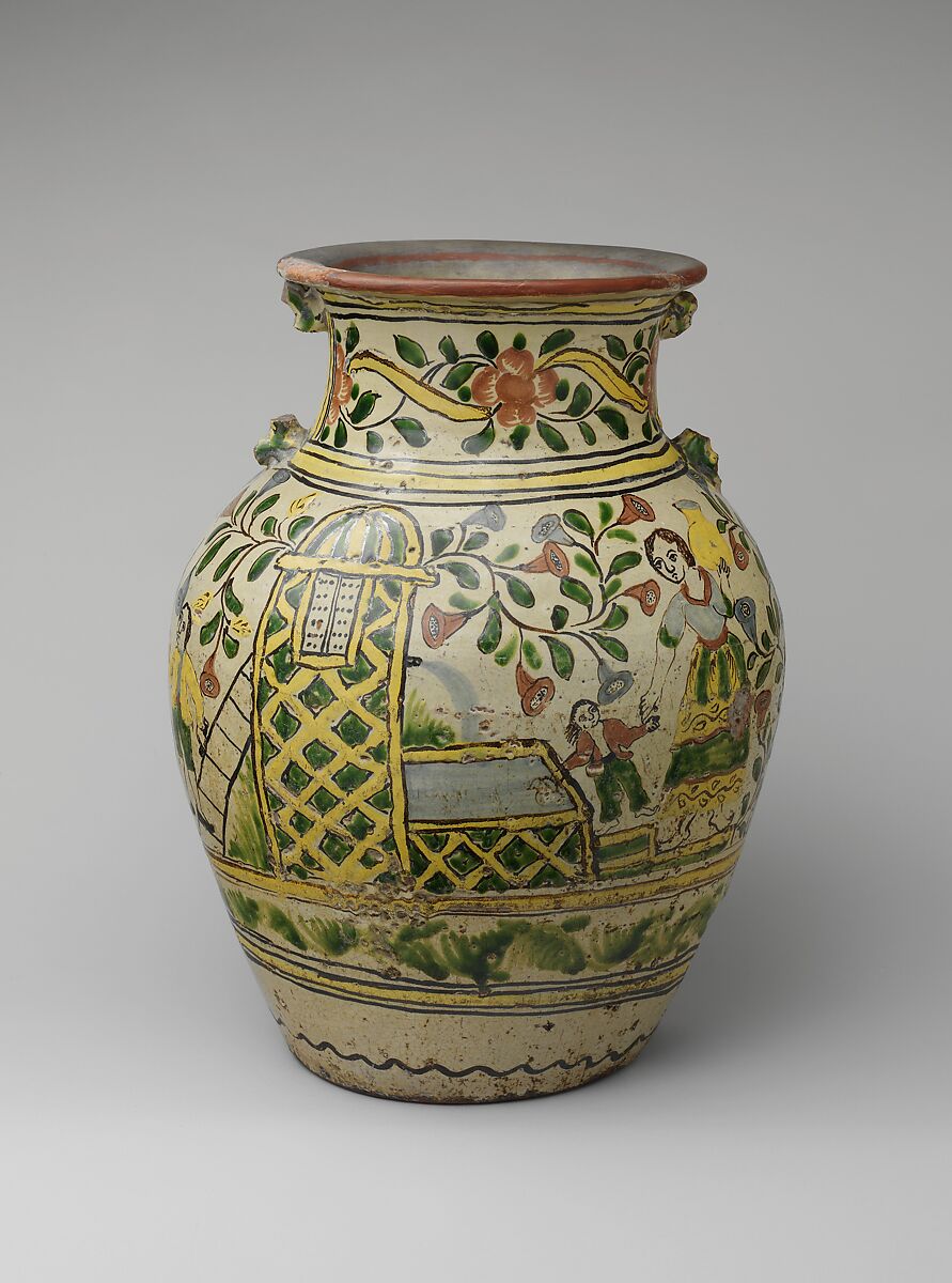 These two jars, which were probably used to store water, are decorated with lively scenes centered on the public fountains that provided water for daily use. Subjects include popular types like the water carrier, burdened by his characteristic chochocol, a large earthenware jar used to deliver water. In another scene, a bloody brawl between two water carriers has broken out. The treatment of these subjects belongs to the literary and pictorial tradition of "costumbrismo," which highlights the customs, occupations, and dress of a particular place.