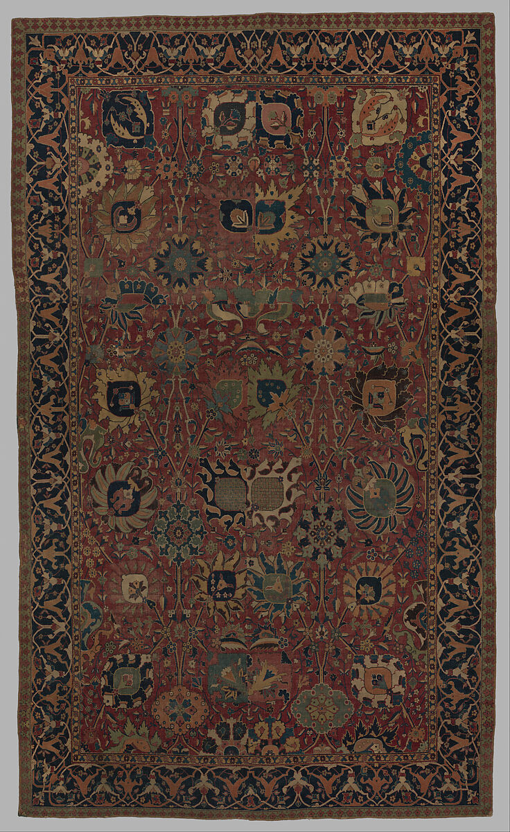 Although this carpet has been reduced in length and width the ogival layout can still be discerned. Large floral forms are arranged diagonally on vines which create these ogival systems. Known as "vase-carpets" by the sporadic presence of vases in the pattern, these carpets traditionally have four vertical rows of flowers. Although some "vase" carpets are attributed to the sixteenth century, this one probably dates from the seventeenth century on the basis of the border design and the comparatively simplified drawing of the flowers in the field.