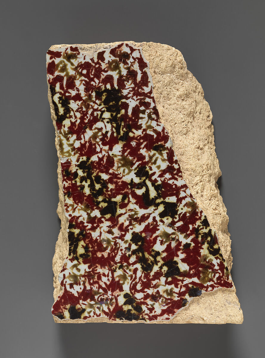 This earthenware tile was covered with a white glaze, fired, painted with metallic pigments in three colors, re-fired, and then polished. Designers of Abbasid period put this new glazing technology, known as luster painting, to innovative use at Samarra to replicate the sheen and mottling of semiprecious stones using locally available materials.