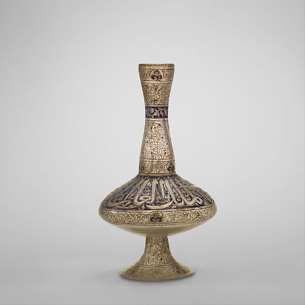 The prominent thuluth inscription is addressed to an anonymous sultan who, according to standard Mamluk formulas, was "the King, the Learned, the Just." The absence of the sultan's name, however, suggests that this bottle was used for the general market rather than following a specific commission.