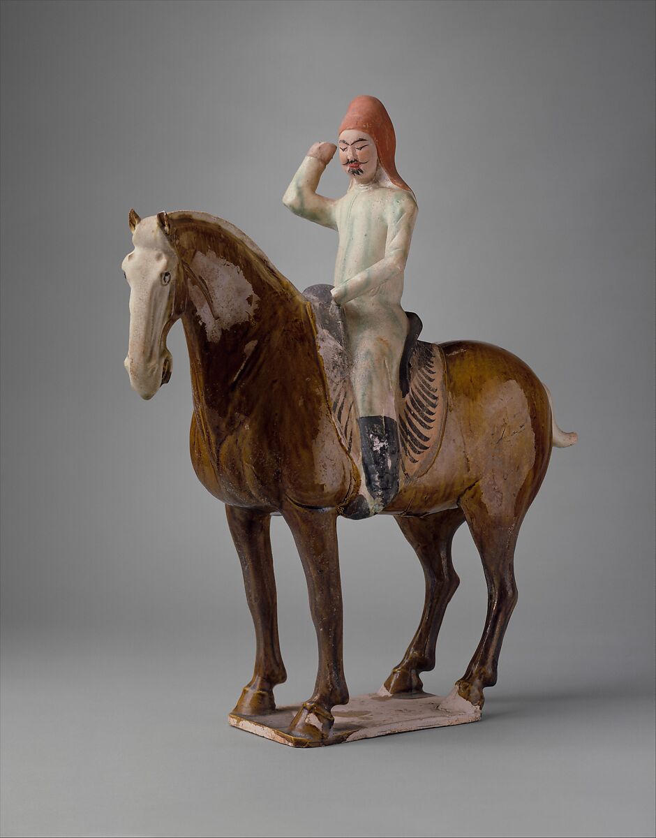 The horse itself was a potent image during the vigorous expansion of the Tang "golden age." Chargers such as this large horse were both the reward of military incursions to the west, and the foundation of imperial stability that would in turn encourage trade and prosperity over a vast empire. The most sought-after steeds were known as "blood-sweating horses"; raised in the western kingdom of Ferghana, they were sent in great numbers as tribute to the emperor. Horses also were a sign of wealth: strict sumptuary laws limited the use of the horses to people of a certain rank and even those serving in the military, such as the hooded soldier saluting from astride this horse, had to provide their own mount.
