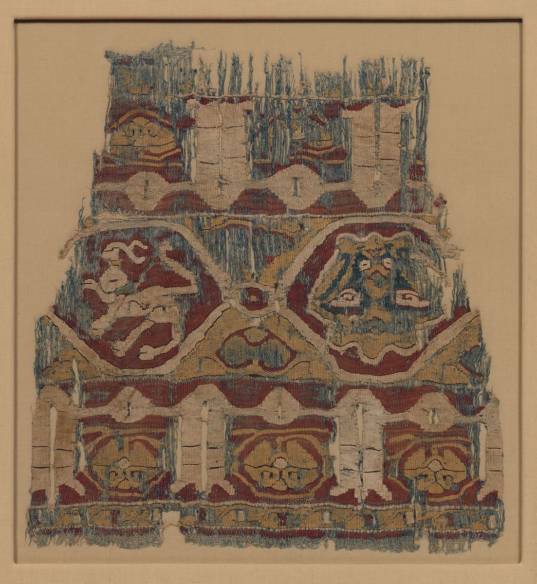 This linen tiraz textile is enlivened with vibrantly colored red, blue, and yellow animals and medallions. Unlike most tiraz, in which the primary decoration is an embroidered inscription, this textile depicts a hare and confronted peacocks. While the decorative motif refers to pre-Islamic Coptic and Sasanian textiles, the textile’s late date of the eleventh century reflects a trend toward classical revival in Fatimid artistic production. The stylized kufic inscription is based on the Arabic word for God, "Allah."