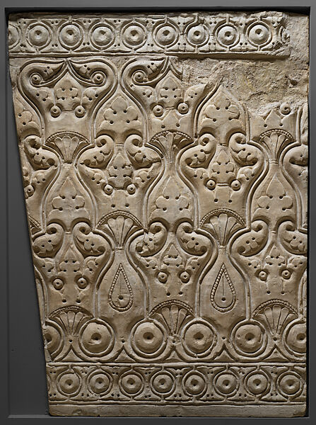 This panel exhibits the Beveled style associated with the Abbasid palace city of Samarra. It is one of a pair of wall panels casts taken from surviving ninth‑century buildings during excavations at Samarra in the first quarter of the twentieth century.