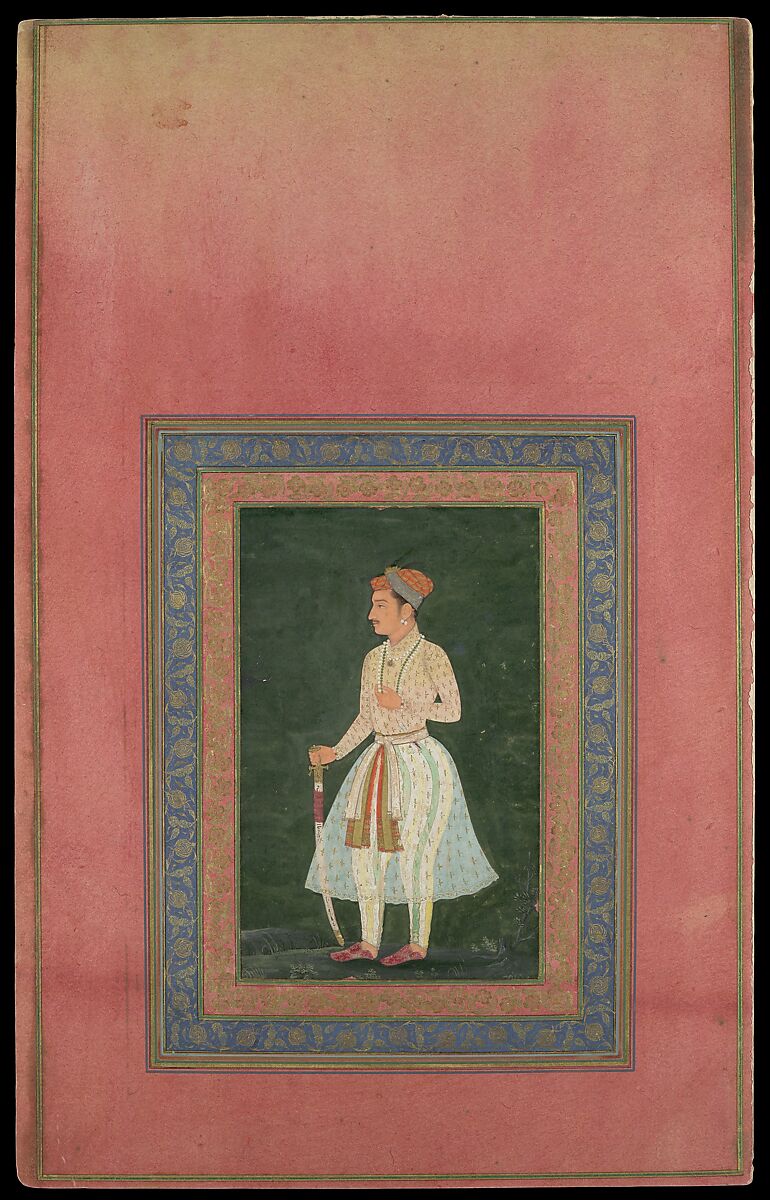 This unidentified nobleman is dressed in the fashion of the Jahangir period when the double patka (sash) came into vogue. However, the treatment of the dark ground and figure suggest that it is from a later moment in the seventeenth century, based on an earlier model.