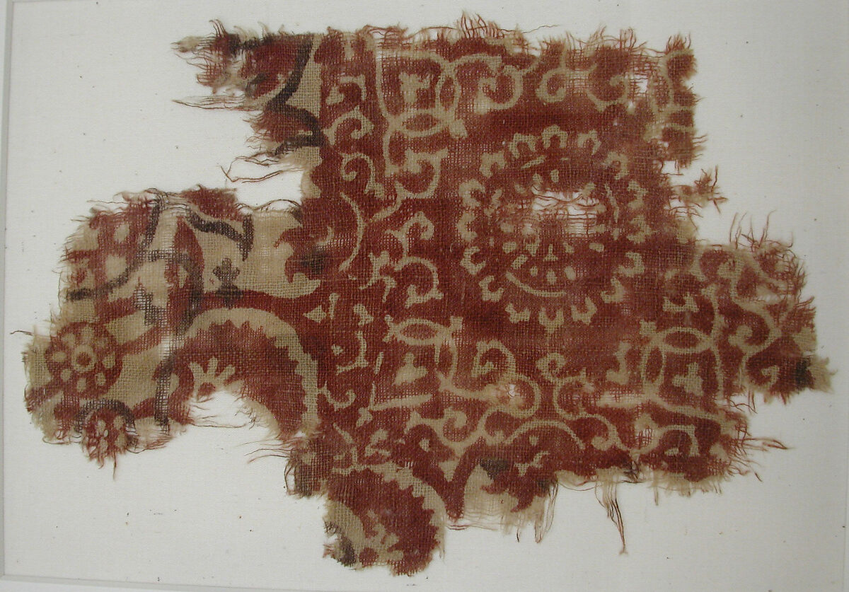 The bold tendril design which links small medallions and six-pointed leaves recall designs found in the decorative programs of Jain painted manuscripts and architecture produced in Gujarat. The vibrant red color comes from the Indian mulberry plant, an organic material, which was commonly used in the dye practices associated to the province of Gujarat and ultimately attests to the site as a highly popular producer and processor of these vibrantly dyed textiles. This fragment demonstrates the close maritime relationship of trade and exchange between Gujarat and Egypt linked by the Red Sea during medieval times.