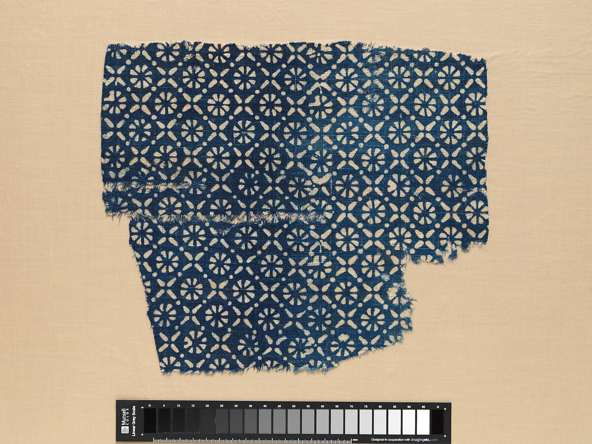 - Medium: Cotton, plain weave; block-printed, resist dyed.
