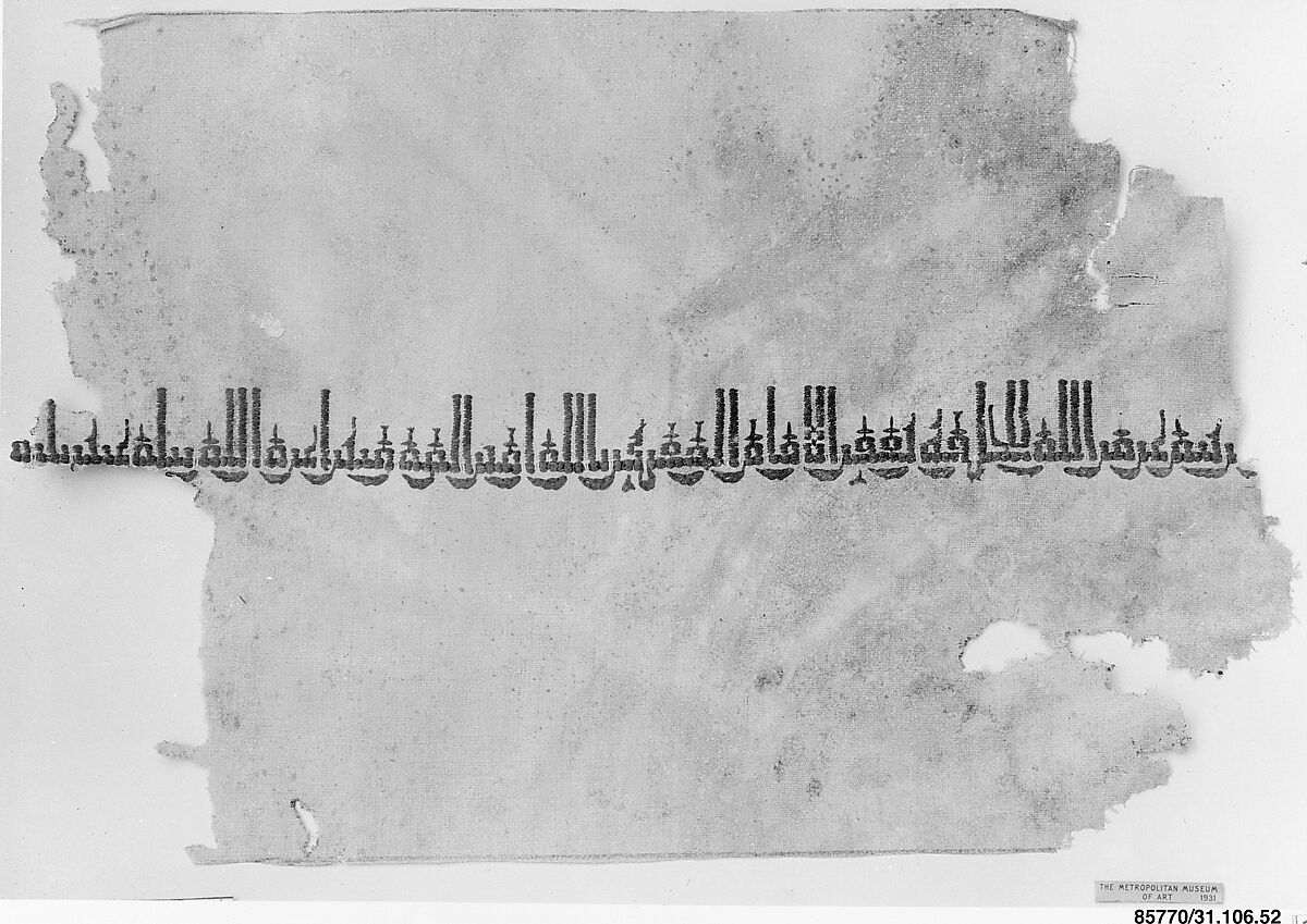 Undyed linen embroidered with Arabic inscription in red silk in satin. The inscription tells us that is from the workshops of the caliph al-Muqtadir billah. Such expensive cloth were handed over to dignitaries as an honorary gift.