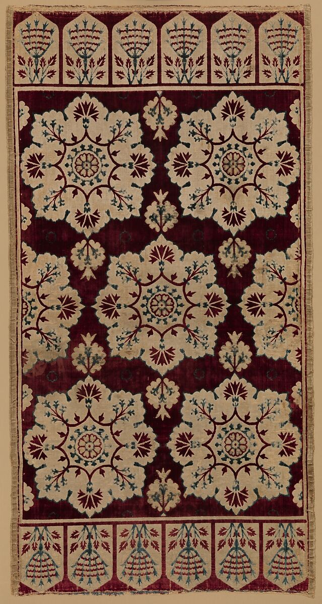 Rectangular silk velvets, such as this textile, would have been used to cover cushions, or yastik, on a low seating platform. They feature staggered rows of dramatic floral medallions set against a crimson ground. The ends of the textiles exhibit borders of repeating floral motifs set into rows of small arched forms known as lappets.