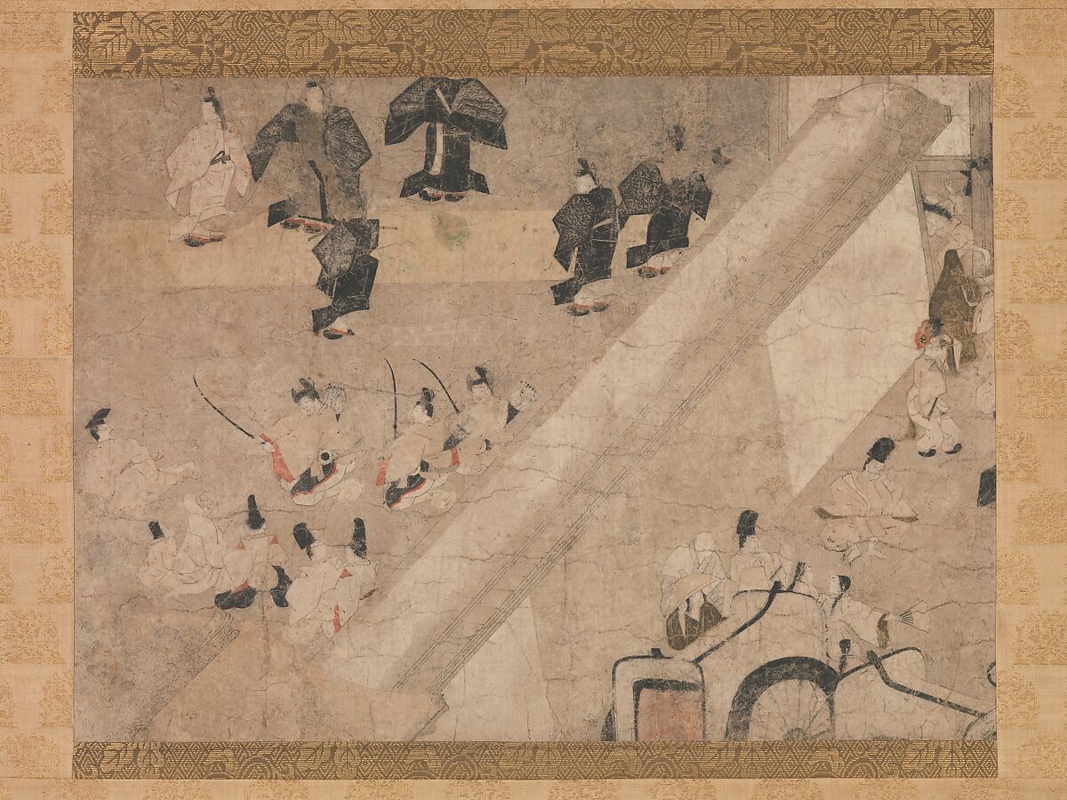 A horse race in autumn 1024 is the setting for this episode from the quasi-historical account of the life of Fujiwara Michinaga (966–1027), the great Heian-court statesman, imperial regent, and patron of the arts. As the race is about to begin, visitors of various courtly ranks make their way to the viewing stand. In addition to detailing the career of Michinaga, the Tale of Flowering Fortunes (Eiga monogatari) is a chronicle of aristocratic life in Kyoto during the Heian period, with descriptions of rivalries, marriages, births, and deaths within the rarified atmosphere of the imperial court.