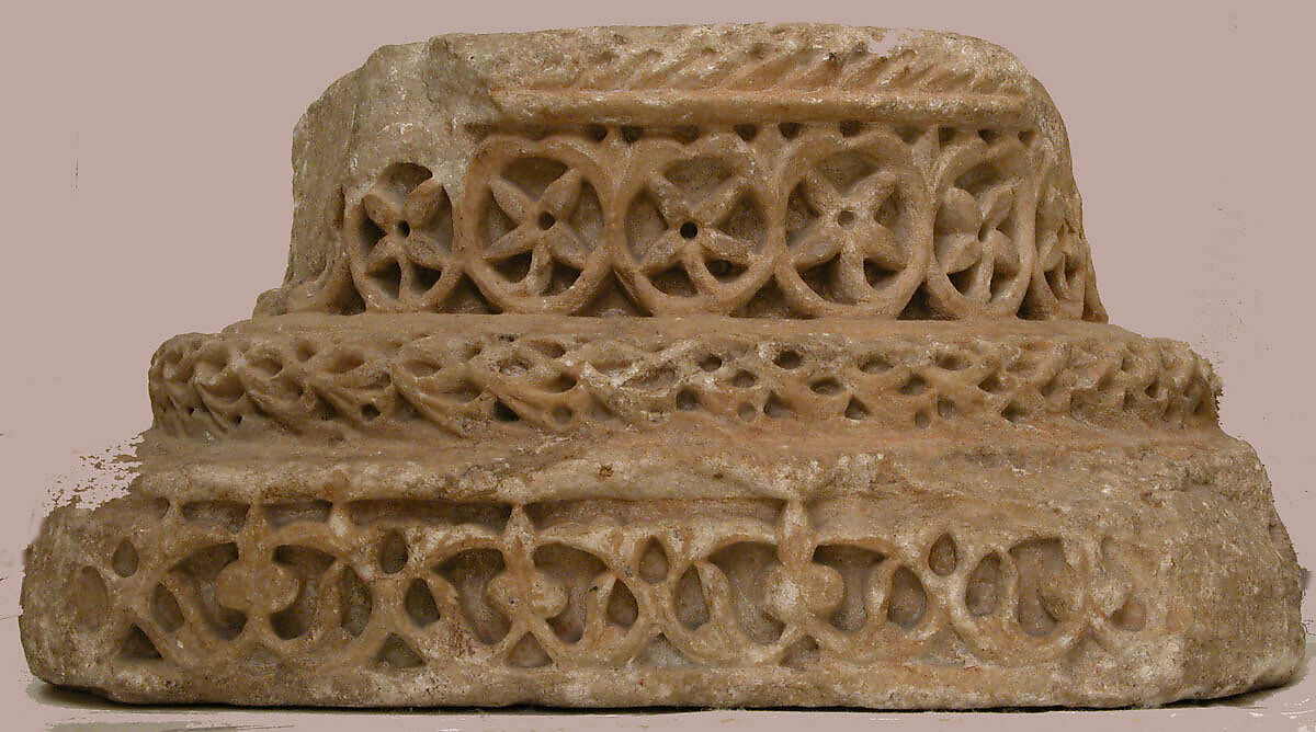 This column base probably came from the splendid Umayyad royal residence city of Madinat al-Zahra, near Cordoba, Spain, which was founded in 936. The classical tradition, so important in Umayyad Syrian art is no less evident here, which is not surprising in light of the Syrian roots of this caliphal house (711–1031) that arose in Spain after the Umayyad dynasty was replaced and almost extinguished by the new 'Abbasid rulers centered in Baghdad.