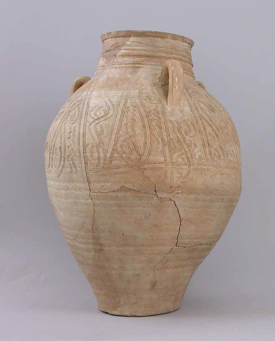 This jar was excavated a Qasr-i Abu Nasr, an archaeological site now attached to modern Shiraz in southern Iran. The small town and fortress were located at a strategic point at the intersection of protective mountains, water sources, and along roads entering the plain. The site was occupied, at least intermittently, from the Parthian period (3rd century B.C.–3rd century A.D.) to the Muzaffarid period (13th–14th century A.D.). The major occupation, including the extensive fortress, dates to the Late Sasanian period (6th–7th century A.D.).