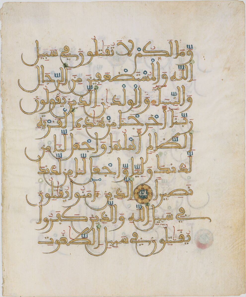 Qur'ans of the Maghreb or the Islamic west, including North Africa and Spain, diverged at an early date from the stream of developments further east. The preservation of a number of archaic calligraphic features derived from kufic and the use of parchment are typical of the region during the thirteenth and fourteenth centuries. Despite these archaizing features, the use of gold ink, the exaggerated curves of the letters below the baseline, and colorful diacritic marks lend the composition a striking rhythmic quality.