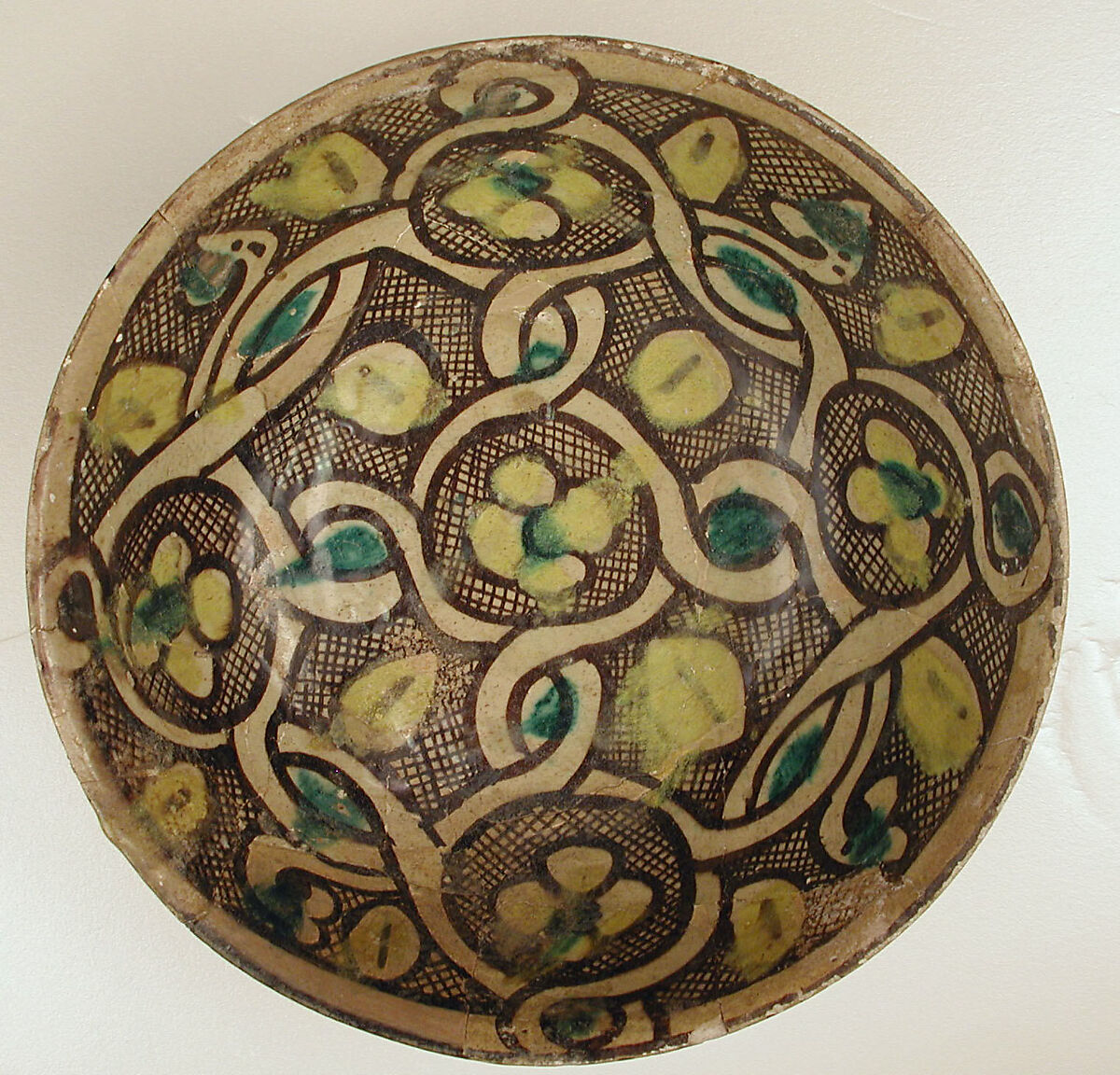 Buffware is known for its lively color palette – usually black, green and bright yellow – and vibrant decoration, which often covers the entire interior of the vessel. This bowl features a simple but eye-catching design. A pattern formed by interlacing bands in white fills the concave surface, breaking up the space into discrete sections. Flowers and flower petals in yellow and green fill the rings formed by the bands and the spaces in between rings. The background is covered with a tight mesh rendered in black slip. Such interlace decorations appear frequently on the buffware fragments found at Nishapur.