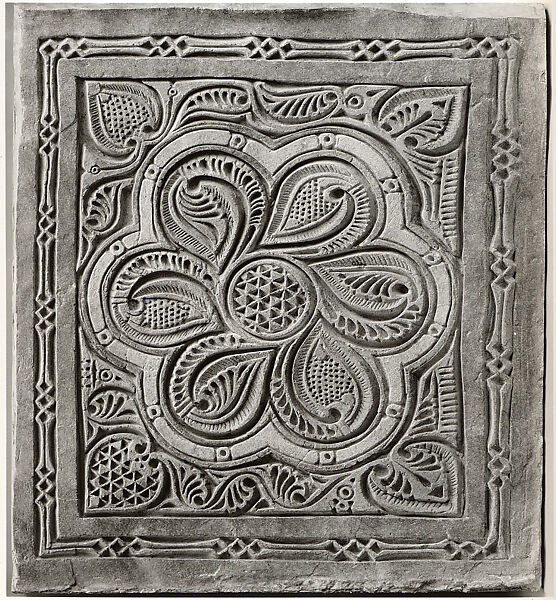 This cast was taken from a square panel excavated at Nishapur from a mound known as Sabz Pushan (the Green Covered). Excavations at Sabz Pushan revealed part of a residential neighborhood with several houses and an alleyway. This piece was found in an iwan, or covered room opening onto a courtyard, richly decorated with carved panels and wall paintings. This iwan may have been part of a private house, but the presence of a mihrab (prayer niche) suggests that it could have also served as a small neighborhood mosque. Other carved panels found in the same iwan include MMA 37.40.40, 37.40.43, 37.40.45 and 37.40.47.