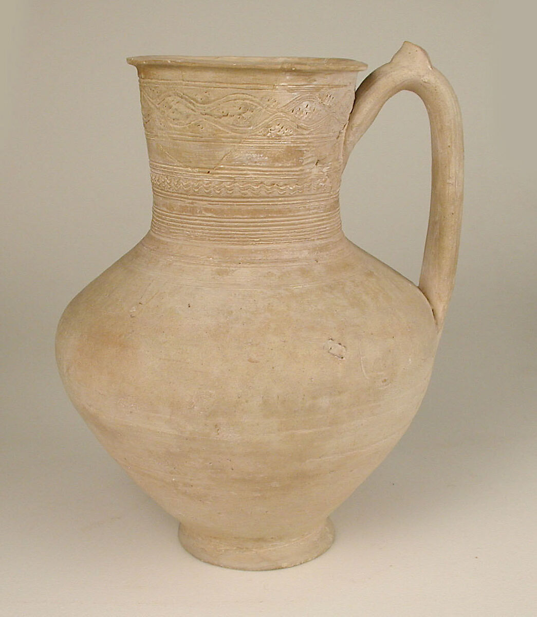 This ewer was meant to hold and pour liquids. It has an ovoid body, a neck that flares slightly, and a projecting lip. A vertical handle with a thumb-rest is attached near the middle of the neck on the vessel’s shoulder. The neck of the vessel is decorated with incised straight lines bordered by bands and wavy lines. The bottom register has a series of combed incised lines. Many unglazed earthenware vessels like this were used for cooking, but even more so for storing water. These vessels also functioned as lanterns, lamps, candlesticks, flowerpots, containers for coins, and toys.
