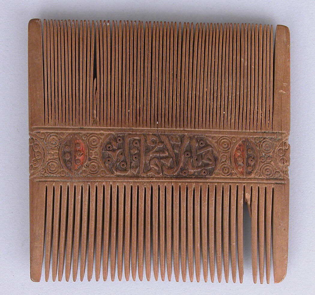 Bath accessories are handy for beautifying the body after it has been scrubbed and cleaned. Cosmetic cases, perfume bottles, and combs were brought to the hammam by owners to help them dress as they turned attention to their appearance. This comb includes inscriptions on both sides, which wish its owner luck. One side features the phrase “Everlasting Glory,” which continues on the other side “and Prosperity.”