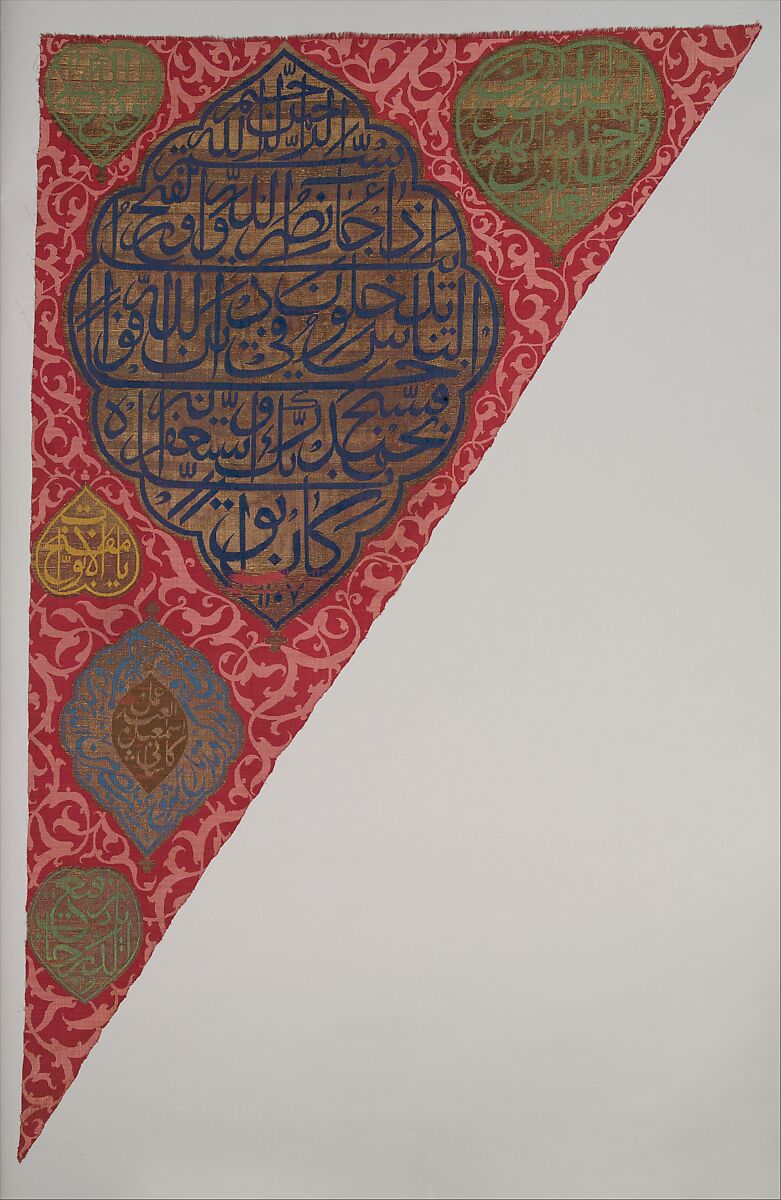 This rare example of a Persian military or ceremonial banner invokes divine protection and assistance. The lobed medallions enclose quotations from the Qur'an, lauding God as "the best Protector" and "Opener of Doors." Banners such as this were carried in battle. They appear in illustrated manuscripts such as the Shahnama of Shah Tahmasp and are described by travelers to Iran in the 17th century. The name of the maker, Isma'il Kashani, is inscribed in the center of the light blue cartouche. The details of the textile indicate careful planning, beautiful execution, and luxury with no expenses spared.