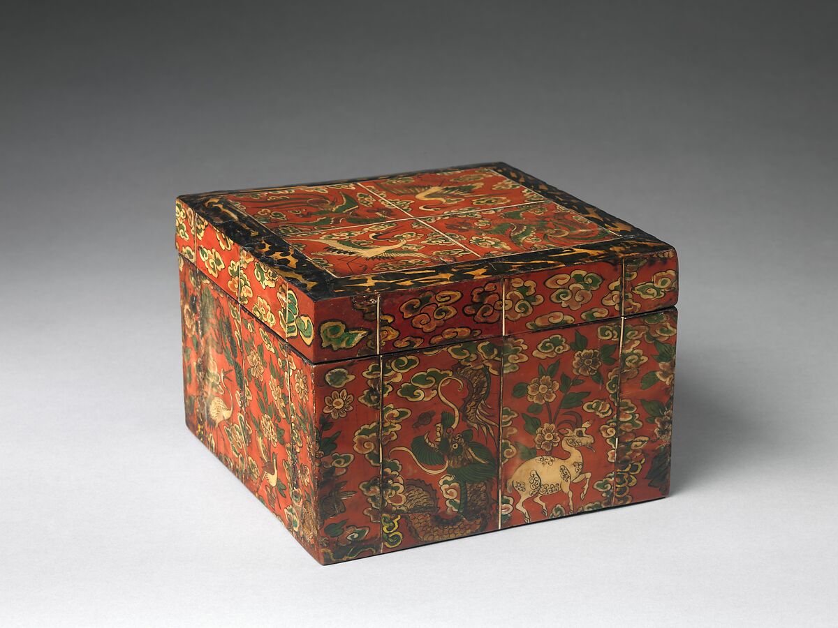 This lacquered wood box is decorated with thin sheets of ox horn painted in bright colors. The technique developed fully in later Joseon lacquer ware, becoming a fashionable art form during this period, alongside lacquer with mother-of-pearl.