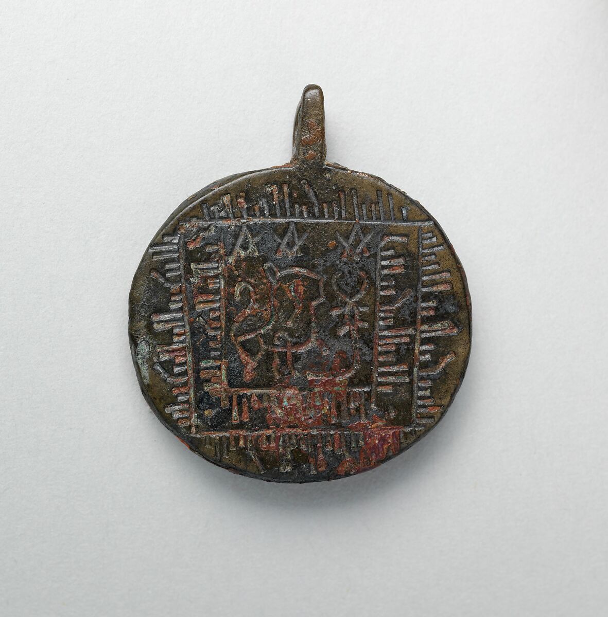 This circular metal pendant is believed to be a talisman, an object that provides protection for the wearer. The pseudo-writing on this pendant, though illegible, resembles the Arabic phrase that translates to, "There is no god but God." It is thought it had talismanic power because belief in this concept is one of the basic tenets of Islam. It has been suggested that the lion and scorpion represent the Zodiac symbols of Leo and Scorpio, which were thought to give their owners protection. But why these two signs in particular are found on so many objects is still unclear. The inclusion of esoteric symbols and images is what sets this pendant apart from later Islamic talismans, when signs with more specifically Islamic connotations, especially legible quotations from the Qur’an or magic squares with letters representing the names of God, became more common.