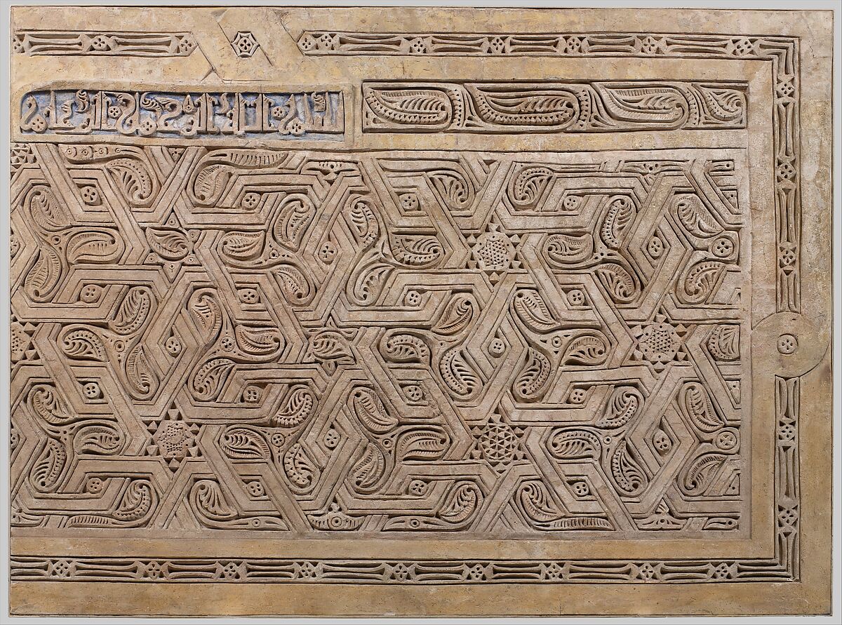 The inscription on the upper left side of this stucco panel reads, "In the name of God, the Merciful, the Compassionate." It comes from the courtyard of one of the houses in the Sabz Pushan neighborhood of Nishapur. The presence of this inscription suggests the residence may have functioned as a small neighborhood mosque or perhaps even a madrasa (religious college). Religious texts, however, were also found on private residences.