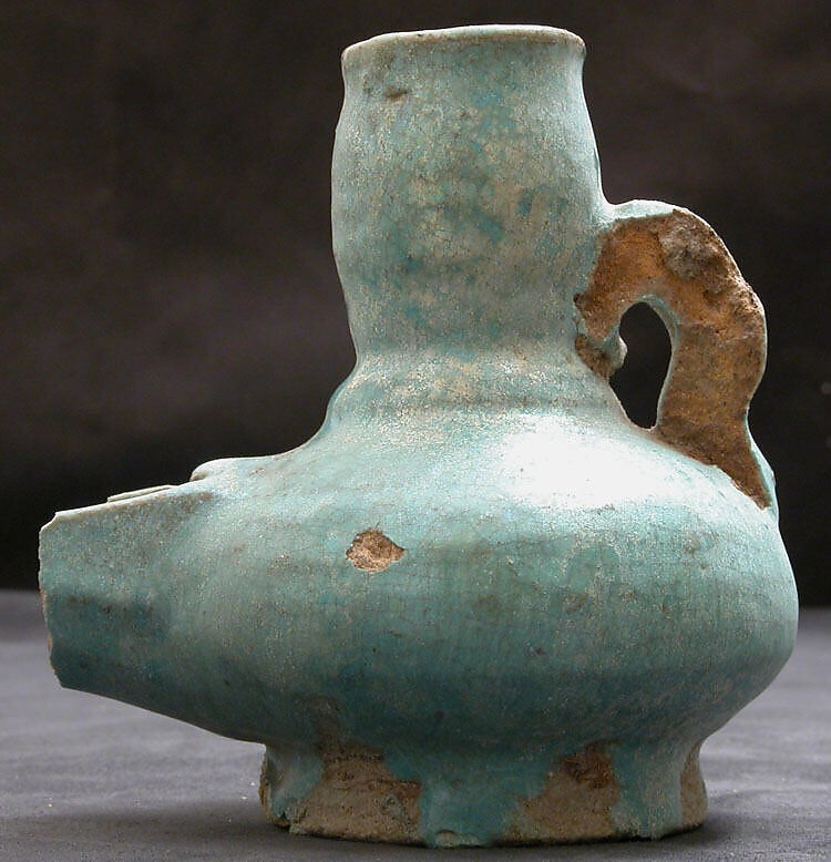 This heavily potted lamp contains a closed reservoir that would have held burning oil and a wick. Soaked in the oil and lighted, the wick would transport the fuel to the flame. Similar ceramic lamps were common in Egypt in the thirteenth to fourteenth century, together with other examples in which the reservoir is placed on a stem.