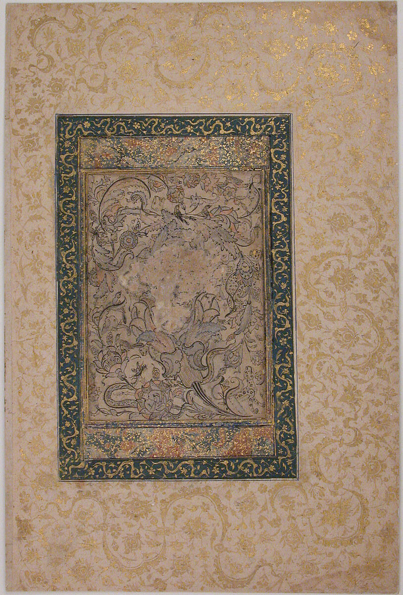 Ornamental brush drawings with lush foliage bearing a variety of human figures, animals, masks, heads, and often, though not here, mythological beasts first appeared in the Jalayrid court in the late fourteenth century. The genre flourished in the Timurid period in Herat when this drawing appears to have been made, as indicated by the figure style. The tradition later made its way to the Ottoman court in Istanbul where it continued with exceptional vigor. While all of them rely on a strongly calligraphic basis for the design, those of the Timurid period were executed with particular finesse.