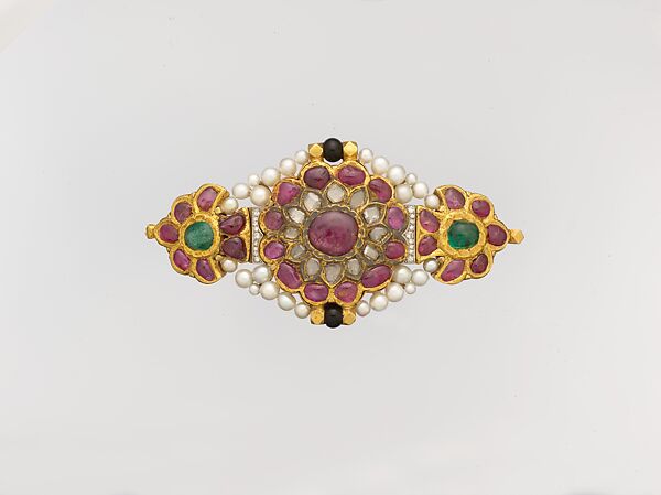 Armbands, called bazubands in Persian, were known in ancient Iran and India. Worn by both men and women, they appear in Mughal paintings of courtly life. This centerpiece of an armband consists of emeralds, colorless sapphires, and very fine rubies arranged in three flower-like groupings. When the armband was transformed into a brooch by Cartier (Paris), rows of pearls were added to its original form.