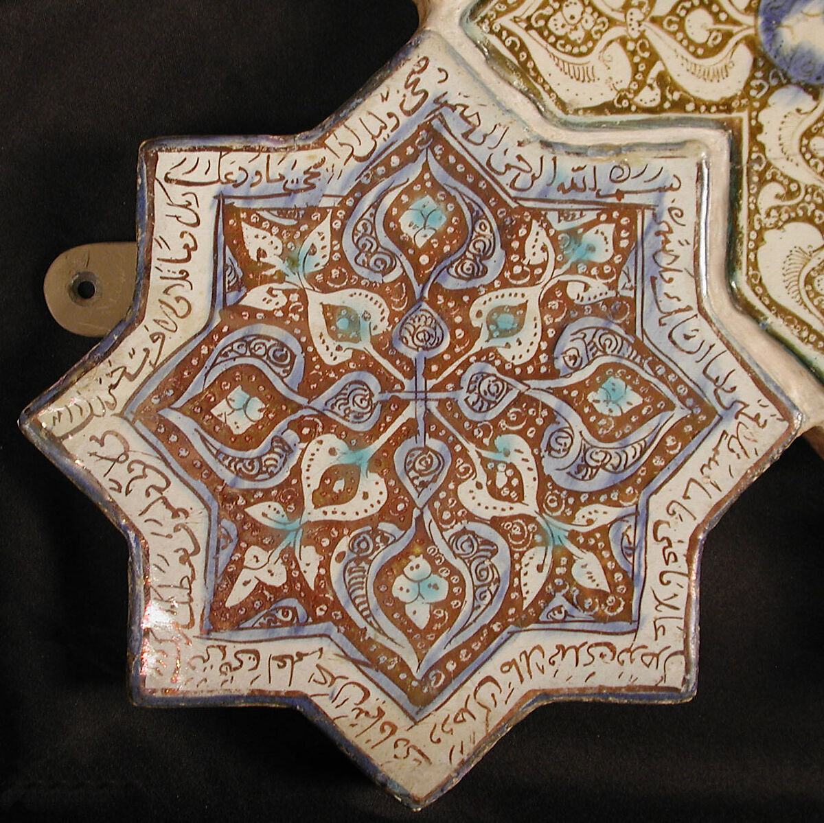 This eight-pointed star tile was probably originally part of a panel of star- and cross-shaped tiles, meant to decorate a wall. The vegetal design was drawn on a luster backdrop which would have caught the light, causing the patterns to shimmer. The effect would have been compounded by the number of tiles on the wall. The motif of cross-style leaf stalks resembles other tiles in the collection (41.165.18), indicating that it was likely a stock motif used by potters in Ilkhanid Iran. Tiles of this type contain a variety of inscriptions in Persian and Arabic, which may relate to the function of the buildings they decorated. This example has inscriptions from the Qur’an, Sura 93 (Ad-Dhuha) in naskh script which is directed to those who are facing hardship and is intended to console them with the promise of God’s mercy and justice.