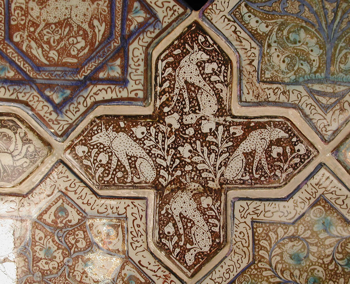 Four seated animals occupy the arms of this cross-shaped tile which was once part of a panel of star- and cross-shaped tiles on the walls of an Ilkhanid building. Probably produced in the ceramic center of Kashan in Central Iran, it displays many characteristics typical of this important site, including the use of opulent luster glaze, a balanced composition with one animal in each arm, and the spirals and dots that fill the background.