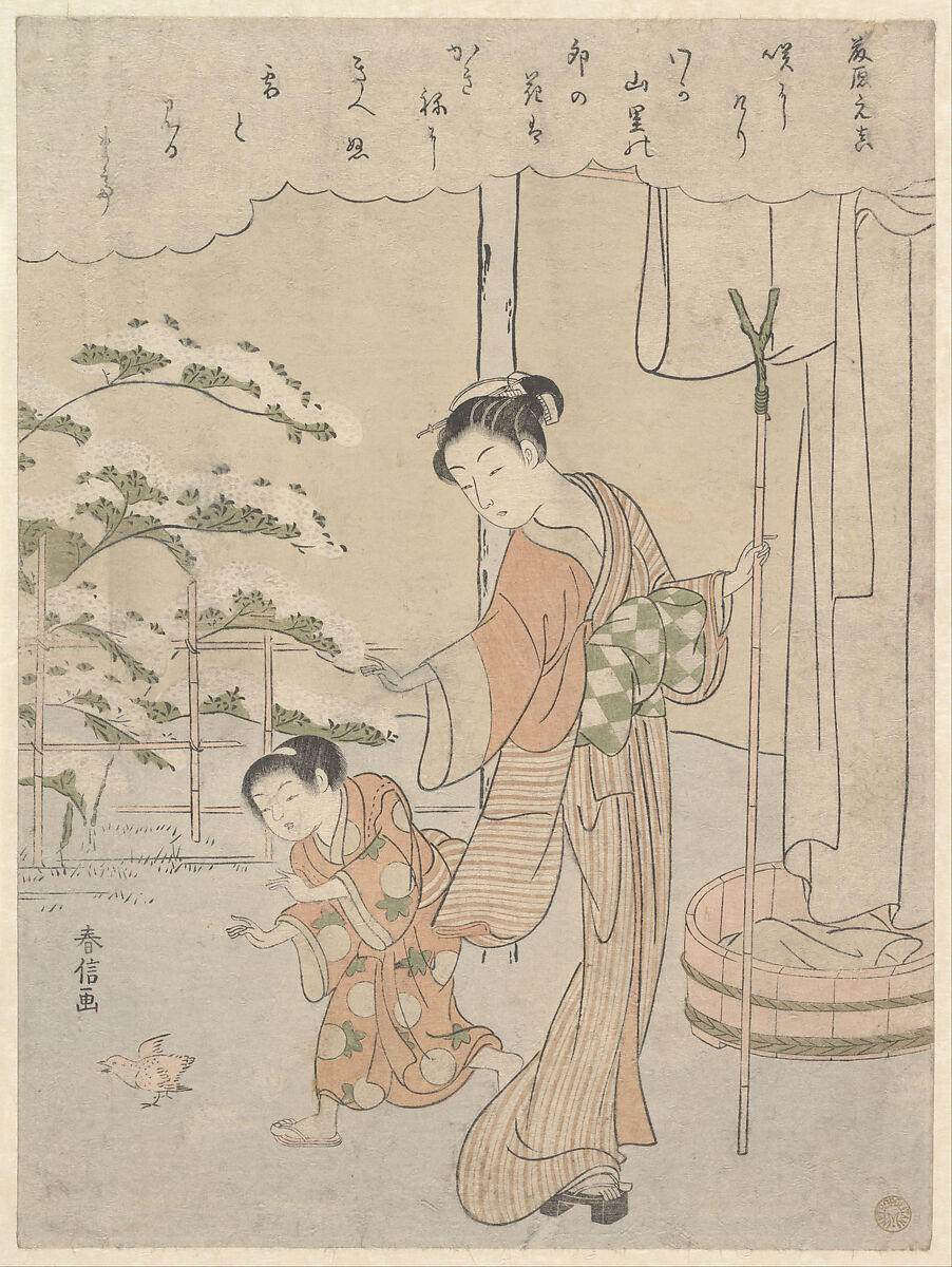 In this illustration of daily life, Harunobu captures a mother's affection for her child. While hanging clothes to dry on a bamboo rod, she follows her son with her eyes as he chases a chick. Looking over her shoulder, she then turns and reaches as if to restrain him.