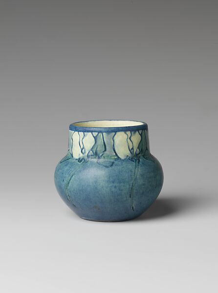 The repeating pattern of stylized white flowers (possibly rosebuds) around the neck of this small vase, each marked by a graceful stem that melts into the blue body of the vase is characteristic of Newcomb decoration. Although Joseph Fortune Meyer (1848–1931) experimented with some mat glaze techniques, the mat glaze was not used for decorating Newcomb objects until 1910 when Paul E. Cox joined the pottery. For other examples of Newcomb Pottery, see L.1982.137.2, 1983.26, and 1981.432.5.
