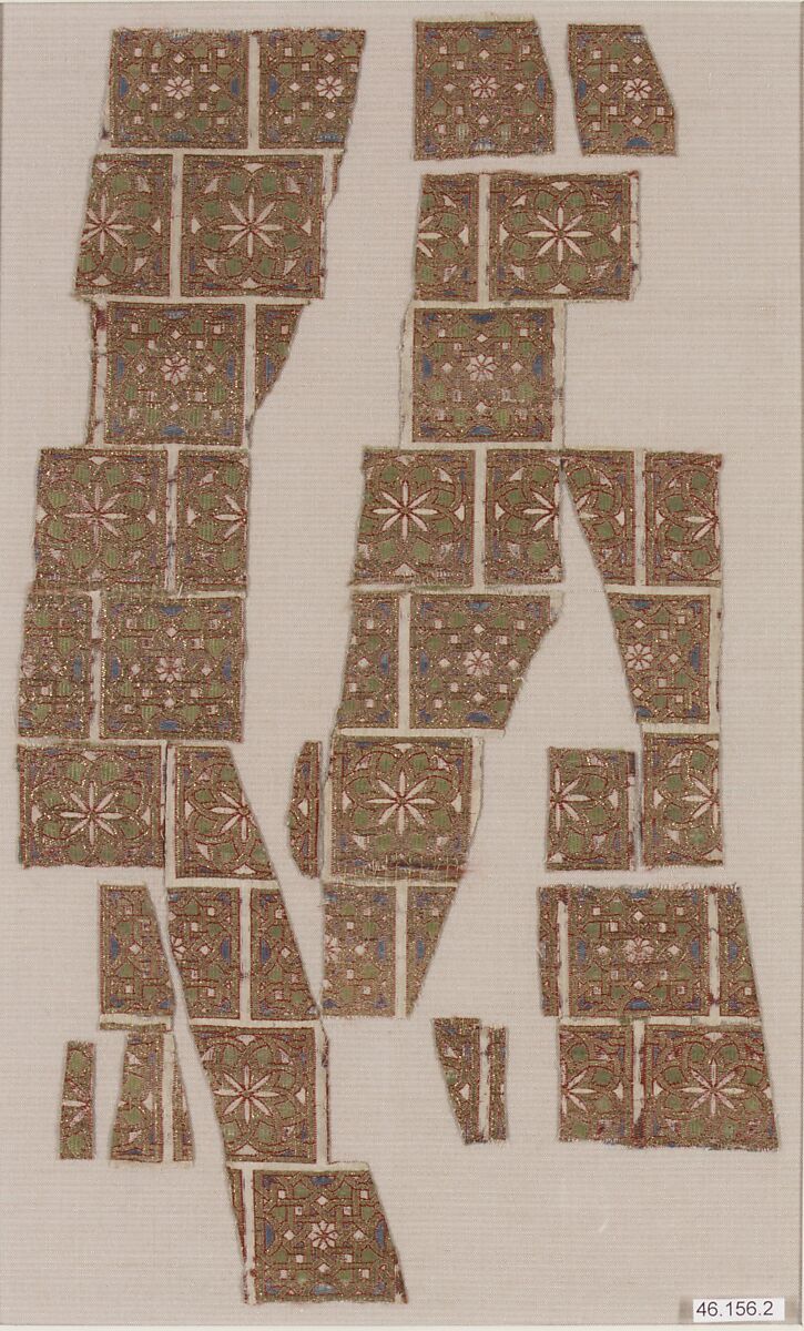 This brocaded textile was originally part of a liturgical vestment manufactured in Andalusia. It belongs to a collection of vestments from the cult of Saint Valerius, who was the bishop of Saragossa, Spain from 290 until 315. During the eleventh century his body was transferred to the Cathedral of San Vicente de Roda de Isábena in Huesca, Aragon, from where relics were dispatched to other churches. The textiles were made to venerate the saint, and were worn on the occasion of his feast day.