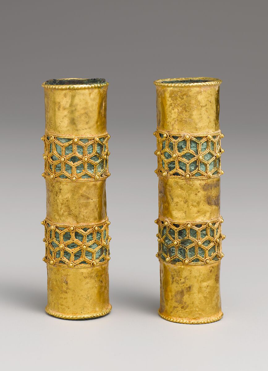 - Medium: Gold; cast, fabricated, engraved, with a copper alloy inner sleeve, decorated with twisted wire and granulation
