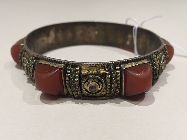 Heavy bracelets, such as this one, were an important part of a woman’s dowry, and served as portable wealth, which could be sold if the need arose. Red coral is commonly found in Amazigh (Berber) jewelry across North Africa, though imitation gems in glass or plastic are also common substitutes for precious stones.