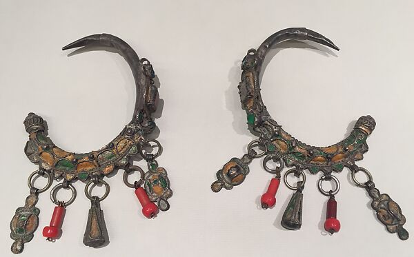 These Berber ear ornaments may have been inserted into the ear or attached to a diadem with chains, and positioned so as to hang on each side of the face, near the ear. This style is known as tikhrazin and is popular in the Rif mountain region. This pair has been ornamented with colored glass, and green and yellow enamel. The orange plastic pendants are an imitation of coral, a more typical material for Berber jewelry, which was thought to possess much baraka, or blessing.