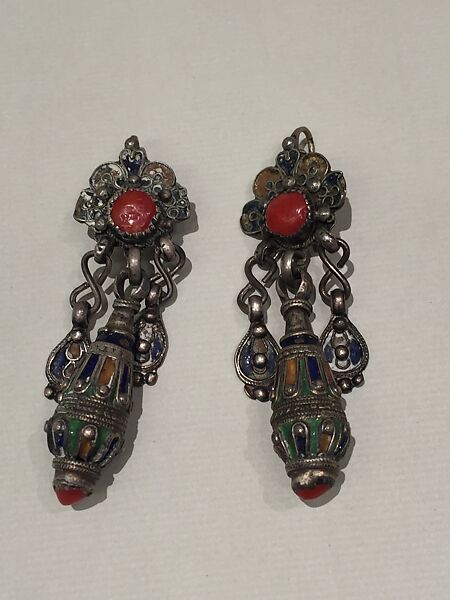 These earrings are ornamented on the recto and verso with brightly colored enamels that are typical of the Kabylie region in Algeria. Enameling techniques in North African Berber jewelry are believed to have been brought by jewelers exiled from Muslim Spain after the fifteenth century Reconquista. While coral was a much valued gemstone in Berber culture, plastic imitation is often found in jewelry from the twentieth century.