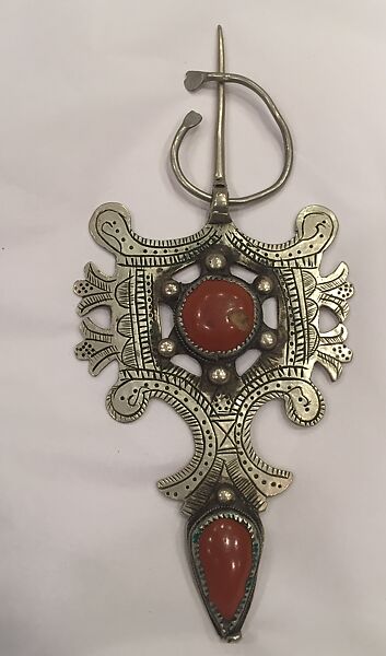 Perhaps the best-known form of North African Berber jewelry is the fibula. Such pins were worn at the shoulder to fasten cloth garments. While coral was a much valued gemstone in Amazigh (Berber) culture, plastic imitation is often found as an affordable substitute in jewelry from the twentieth century. The shape of this particular ornament is sometimes referred to as bzaïm.