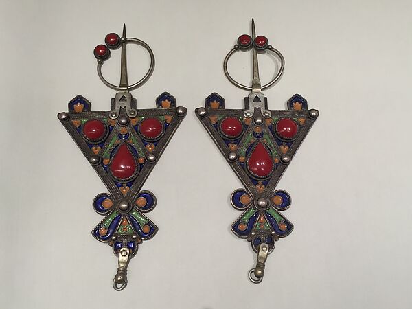Perhaps the best-known form of North African Berber jewelry is the triangular shaped fibula. This large pair would have been worn at the shoulder, and is ornamented on the recto and verso with brightly colored enamels that are typical of the Kabylie region in Algeria. Enameling techniques in North African Berber jewelry are believed to have been brought by jewelers exiled from Muslim Spain after the Reconquista in the fifteenth century.