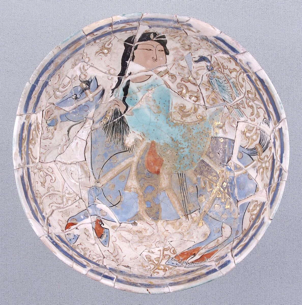 On enameled ware, overpainting can easily be applied without drawing notice, and restorers used it extensively; early twentieth-century practitioners perfected the technique by refiring objects. The horseman bowl’s modern restoration, for example, involved fills made from an identical bowl manufactured for the purpose and a refiring of the reconstructed and repainted vessel.